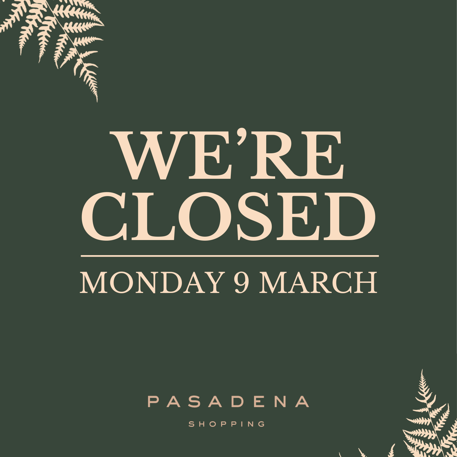 Pasadena Shopping is closed Monday 9 March for the Adelaide Cup public holiday.